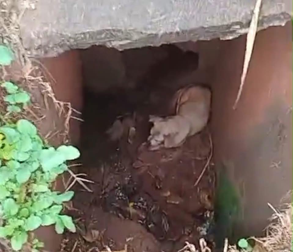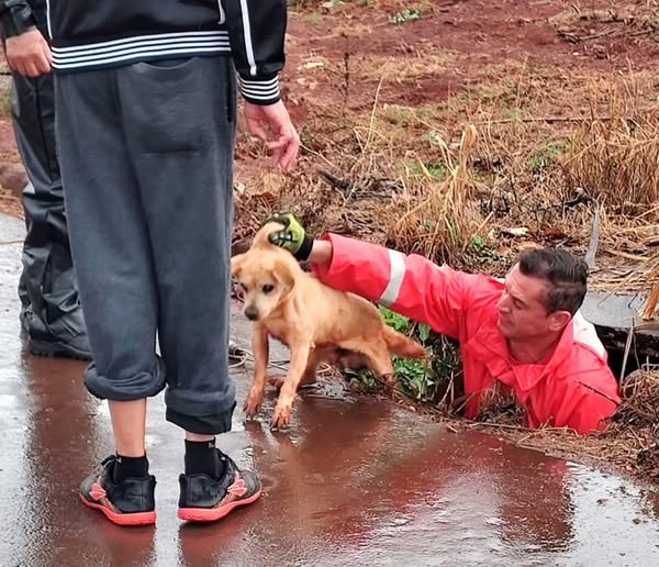 O cachorrinho foi entregue em boas condições, demonstrando alívio logo após ser retirado do bueiro.