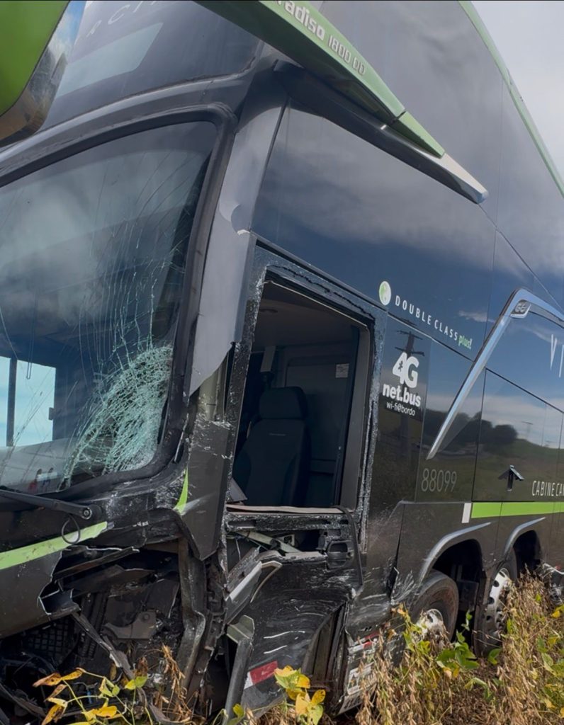 de 33 anos, acabou não resistindo os ferimentos e morrendo ainda no local. Devido a colisão, o ônibus perdeu o freio e foi parar em uma plantação de soja cerca de 550 metro do local da batida.