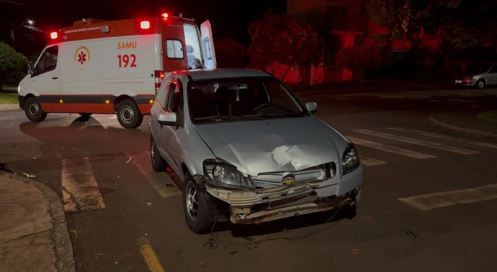Um acidente de trânsito foi registrado na noite deste sábado (21), na Rua Ferrucio Trivelato, no Jardim Paulista, em Campo Mourão, envolvendo um carro e uma motocicleta.
